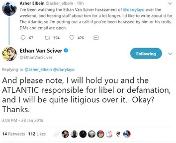At that point, Elbein blocked Van Sciver from sending him further Twitter DMs.