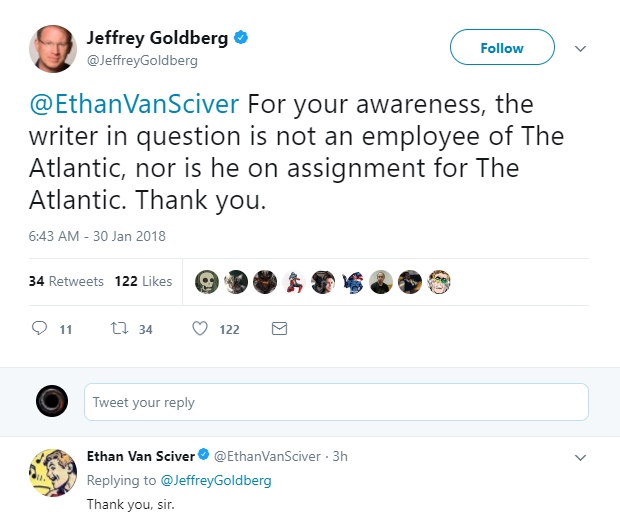 That’s the Editor in Chief of The Atlantic disavowing Asher Elbein. Were Elbein and Shiach LARPing, or is Goldberg running damage control? You decide!